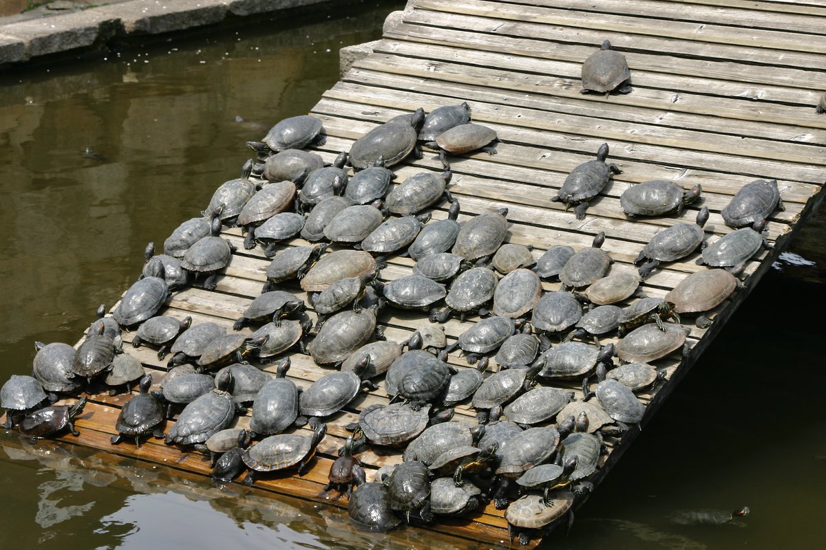 今日も暖かかったですねー。 四天王寺さんのカメたちも甲羅干しです。(^_^;