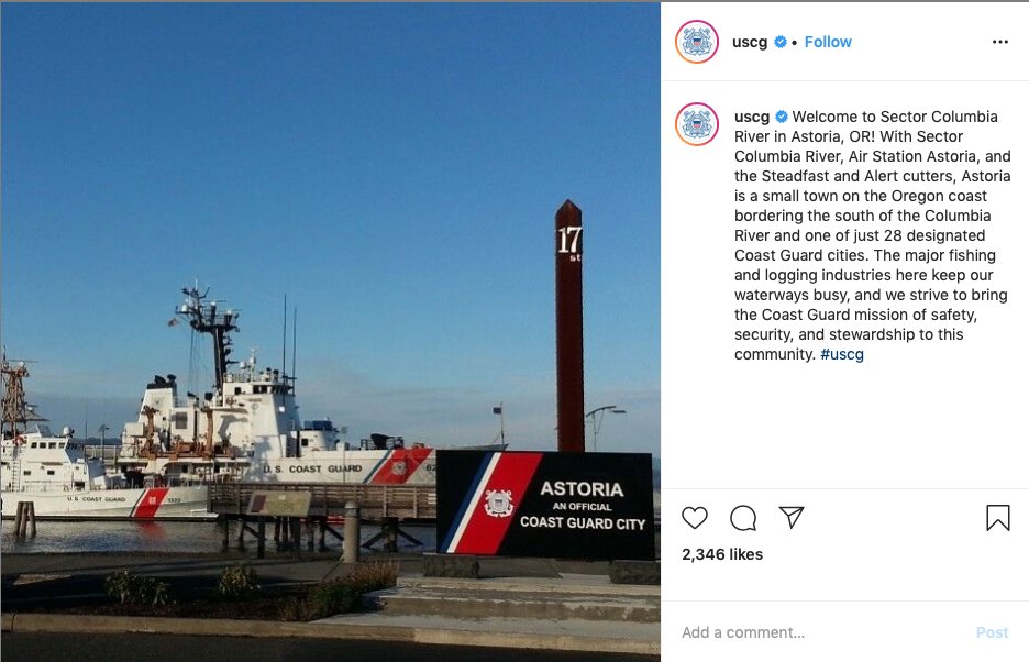 #TravelTuesday:#USCG Sector Columbia River is taking over http://instagram.com/uscg this week. Sector Columbia River is in Astoria, OR, one of the 28 designated Coast Guard cities.pic.twitter.com/GmGME8ZJul