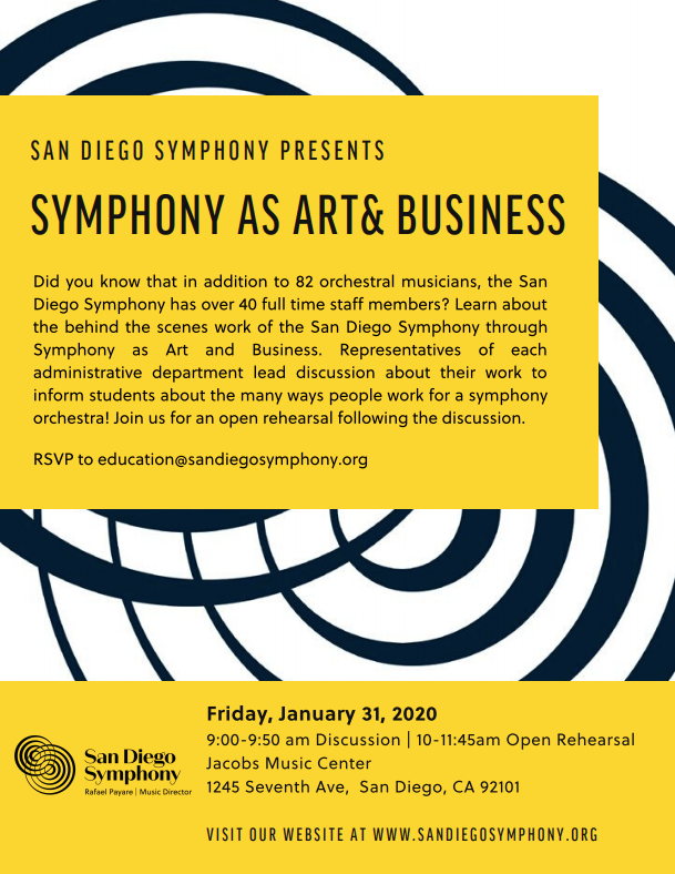EVENT: Did you know that in addition to 82 orchestral musicians, the San Diego Symphony has over 40 full-time staff members? Learn about the behind the scenes work of the San Diego Symphony through Symphony as Art and Business. RSVP to education@sandiegosymphony.orgpic.twitter.com/xs9WzeEVFT