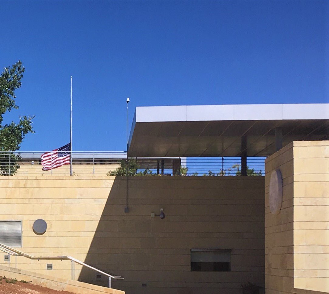 דגל ארצות הברית מונף בחצי התורן בשגרירות בירושלים ובשלוחת השגרירות בתל אביב לזכר 11 קורבנות הפיגוע הטראגי בפיטסבורג, פנסילבניה. יהיה זכרם ברוך.pic.twitter.com/m21rHF612h