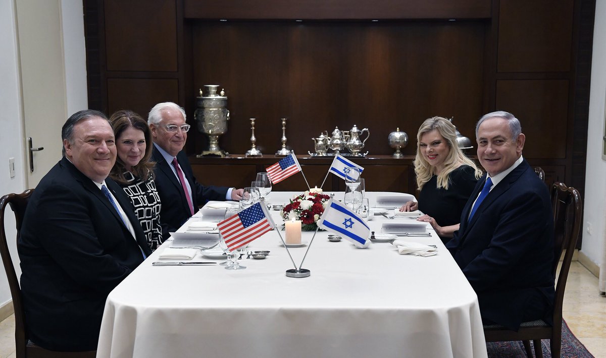 מזכיר המדינה האמריקאי מייקל פומפיאו נפגש עם ראש ממשלת ישראל בנימין נתניהו, שגריר ארה"ב בישראל דוד פרידמן, הגב' סוזן פומפיאו והגב' שרה נתניהו לארוחת ערב במעון ראש הממשלה בירושלים, 21 במרס 2019.pic.twitter.com/x8wl9Y0nKU