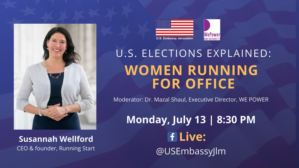 On July 13, 8:30 PM, @usembassyjlm will host @SusannahWDC, CEO/Founder @runningstart. Join us for this third session of our virtual U.S. speaker series #ElectionsExplained to learn more about what it takes for women candidates to win elections. https://bit.ly/2Ch4E9u @mshaul220pic.twitter.com/4Xugo7QRCy
