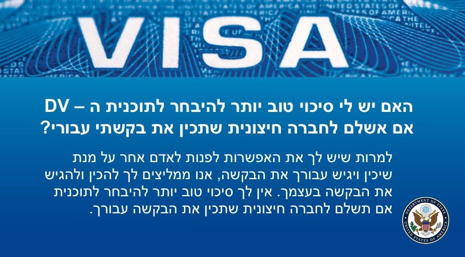 הגשת הבקשה לוויזת 2022 –DV אינה כרוכה בתשלום. התשלום לחברה חיצונית על מנת להכין עבורך את הבקשה אינה משפרת את סיכוייך להיבחר. אנו ממליצים לך למלא את הבקשה בעצמך.pic.twitter.com/lVmDYYXZDS