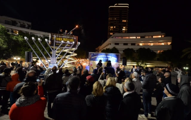 ג'ף אניסמן, דובר השגרירות הדליק אמש נר ראשון של חנוכה יחד עם אנשי חב"ד בכיכר דיזנגוף בתל אביב
