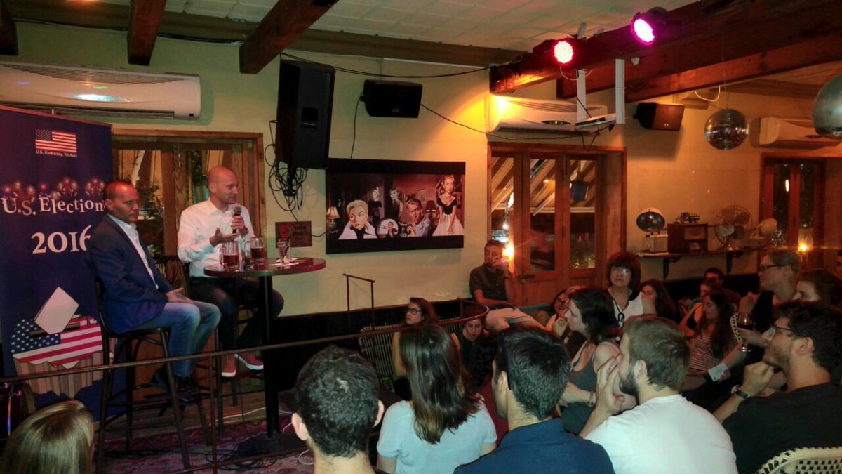 ג׳יי פוטליק (דמוקרט) ונעם נוסנר (רפובליקני) מסבירים על הבחירות בארה“ב לצעירים בפולי בר. @NoamNeusnerpic.twitter.com/EMiETjnsrP