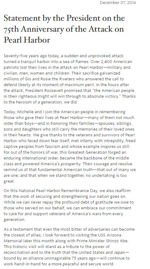 .@POTUS Statement on the 75th Anniversary of the Attack on #PearlHarbor → http://go.usa.gov/x8mM8  #PearlHarborRemembranceDay pic.twitter.com/sfX419wlJa