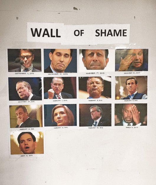 Trump has a "wall of shame" display in Trump Towers of candidates he's taken down so far. http://nymag.com/daily/intelligencer/2016/04/inside-the-donald-trump-presidential-campaign.html …pic.twitter.com/nGstKzjL6k