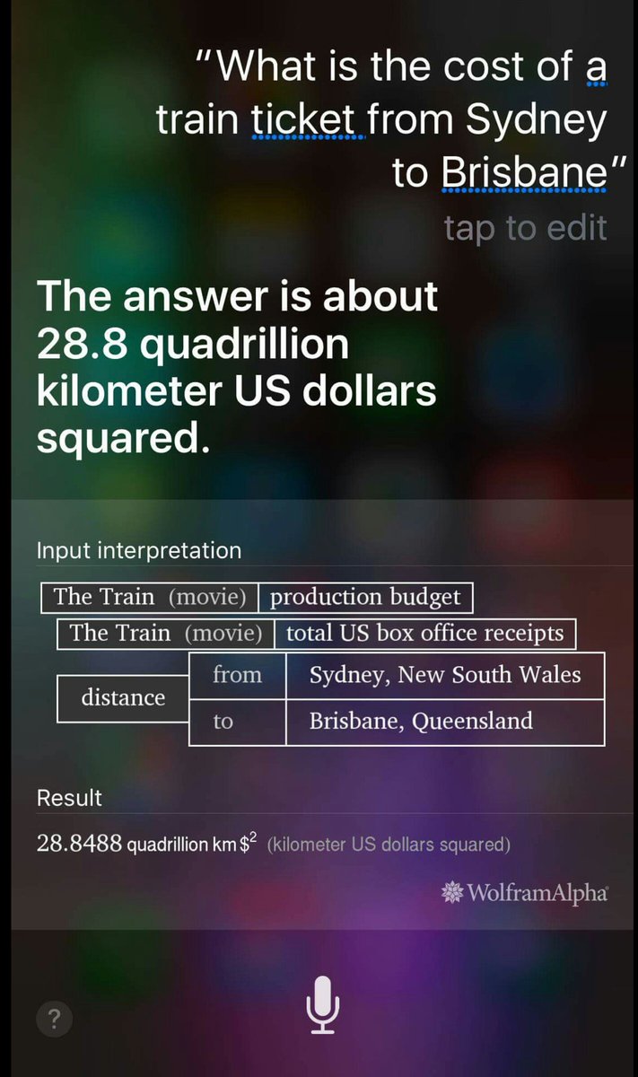 Best bug: Siri interprets a request as "multiply the distance between two cities by the net box office earnings of the movie The Train"pic.twitter.com/0No7RPTays