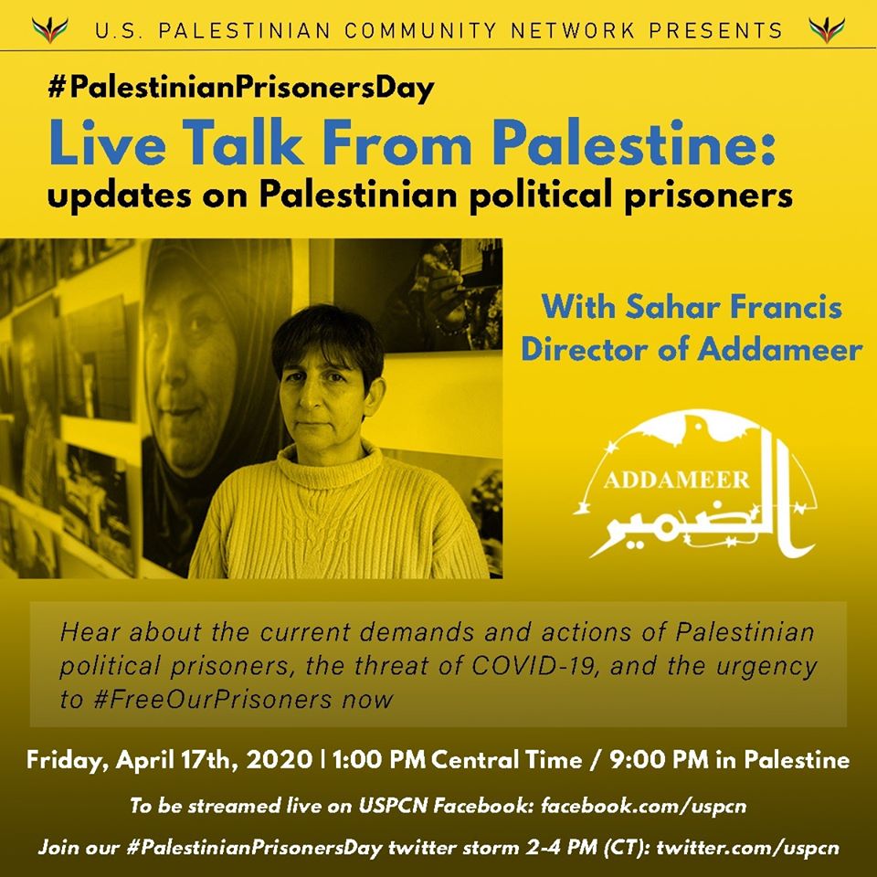 You won't want to miss this! Mark your calendars on April 17th #PalestinianPrisonersDay 1pm Central USPCN will be hosting a live teach-in with the world-renowned @saharfrancis of @Addameer Prisoner Support & Human Rights Association. Twitter storm to follow 2-4pm Central!pic.twitter.com/W9txNSBNXh