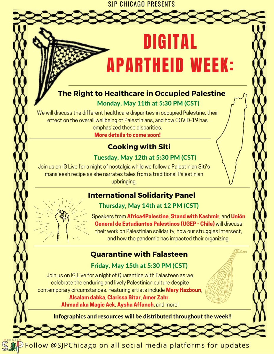 SJP Chicago is hosting a collective virtual Chicago-wide Apartheid Week from May 11-15. It contains variety of sessions from healthcare to international solidarity, & celebrating Palestinian resilience & culture! Follow @sjpchi and stay tuned for content throughout the week! 🇵🇸pic.twitter.com/Z8guQsA90E