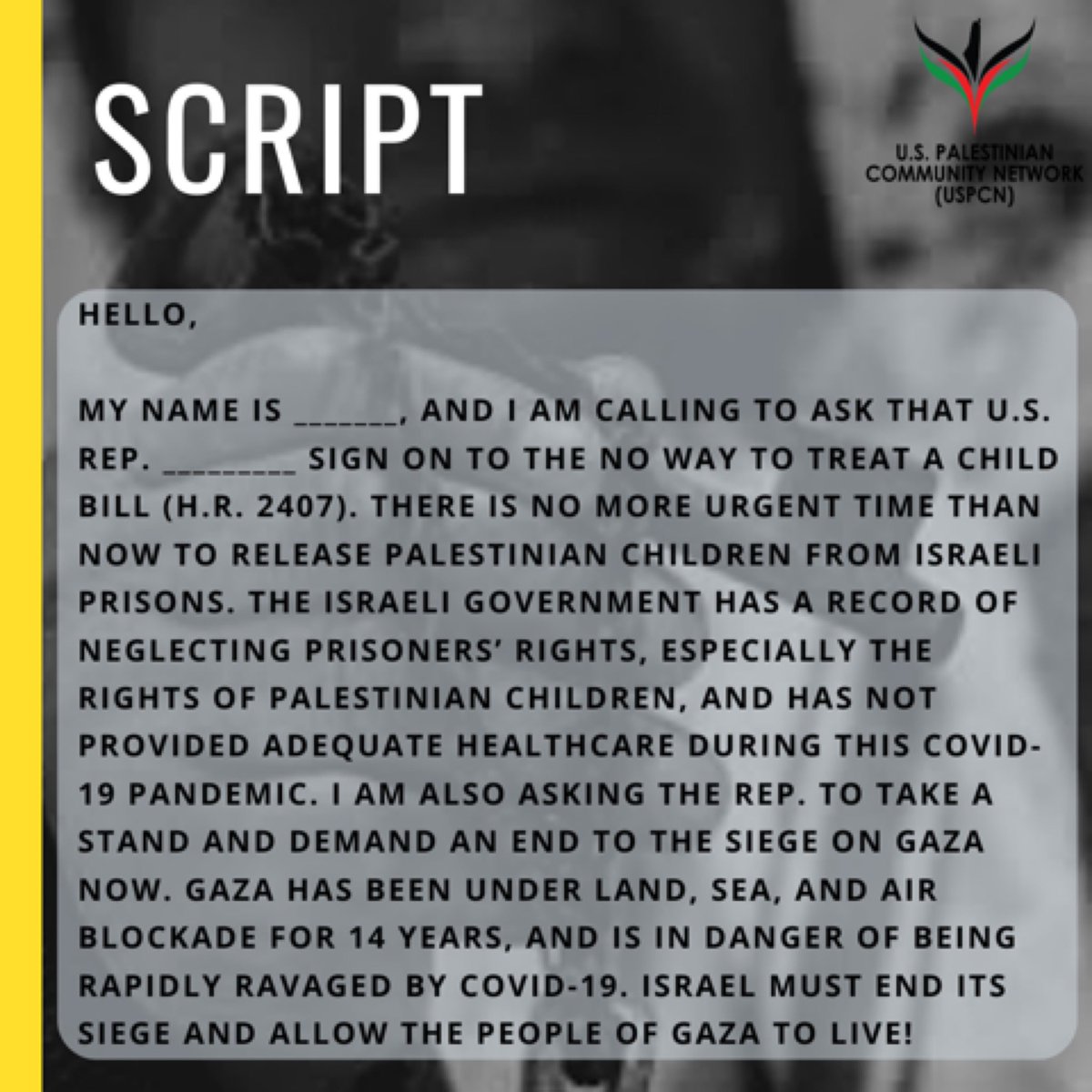 By calling your Congressperson today & demanding they support #HR2407, you show that the arrest, detention, & abuse of Palestinian children at the hands of Israel will NOT be tolerated. Every child deserves the right to live a trauma free life - including Palestinians! #NakbaDaypic.twitter.com/2gHeKJ6yQS