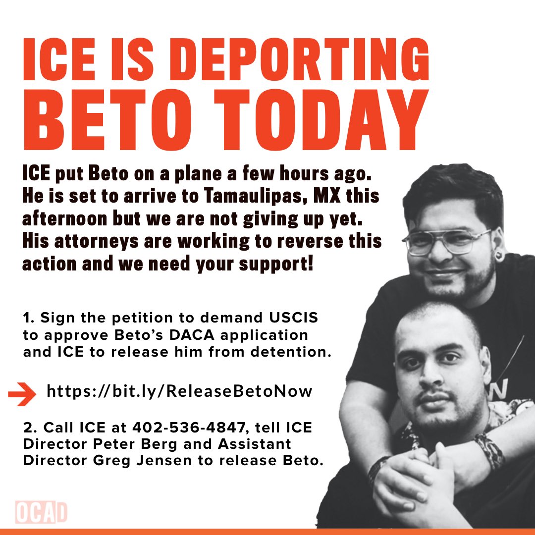 URGENT: Please sign the petition at http://bit.ly/ReleaseBetoNow and call ICE field directors Peter Berg at 402-536-4847 and demand he releases Beto IMMEDIATELY! #KeepBetoHomehttps://twitter.com/OCAD_CHI/status/1270801577788440579 …