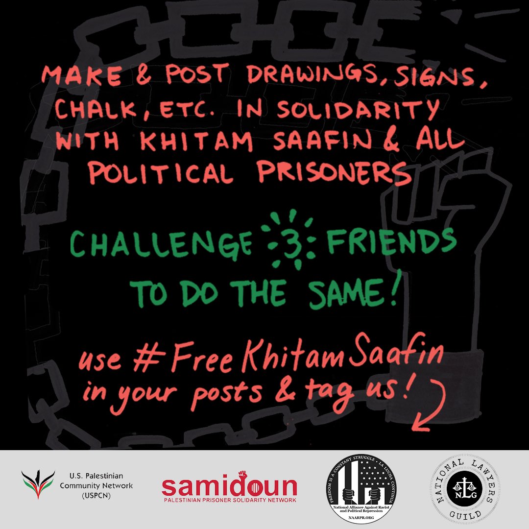 1/2 HR AWAY-Join us, @NAARPR, @SamidounPP, @CAARPRNow, & @NLGnews for a two hour social media storm to demand Israel #FreeKhitamSaafin & #FreeAllPoliticalPrisoners