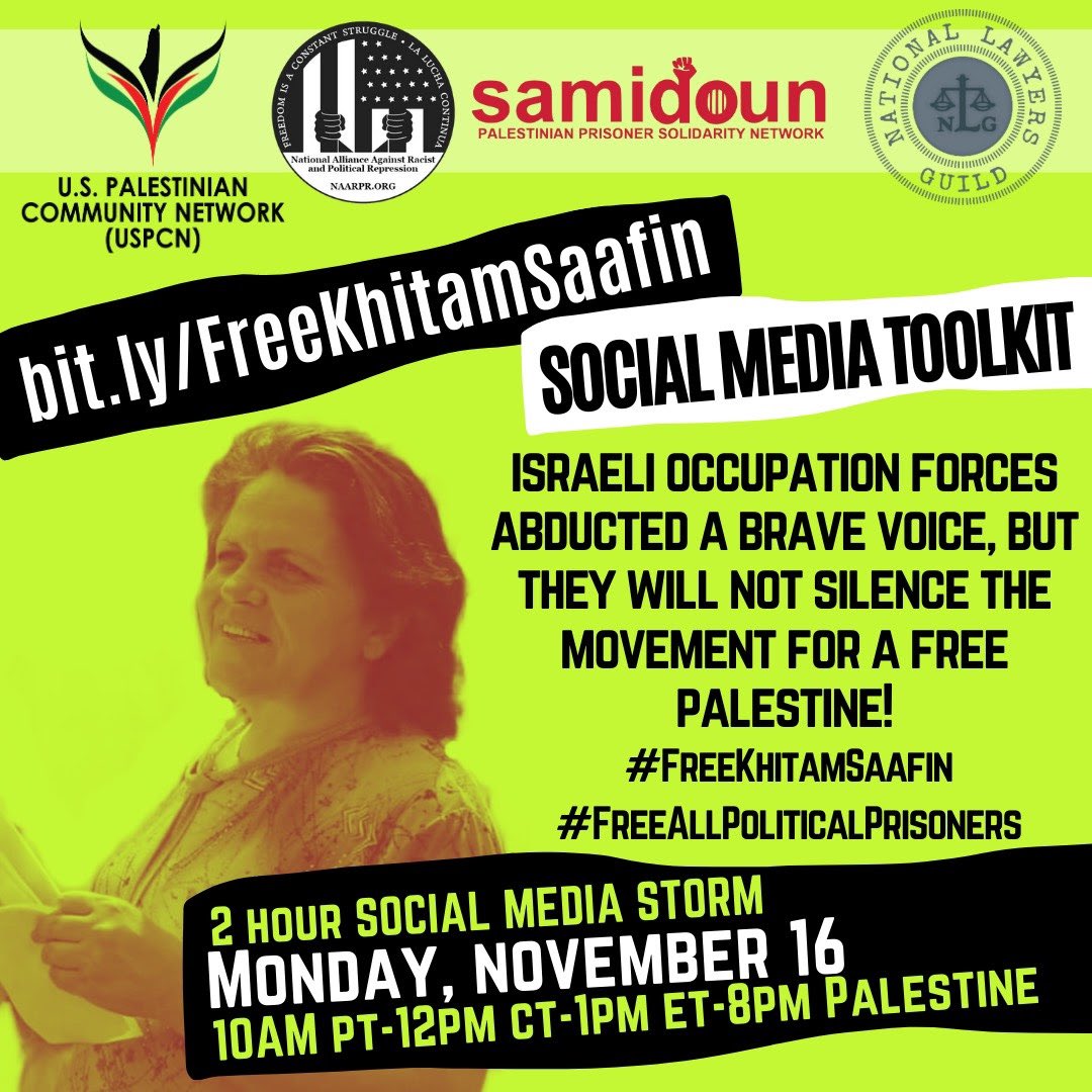 Israel continues its legacy of human rights violations with their recent arrest of #KhitamSaafin, Palestinian feminist and President of @of_committees, who was then sent to administrative detention. Join us in demanding Israel #FreeKhitamSaafin and #FreeAllPoliticalPrisoners!pic.twitter.com/x6KyQCk5jZ