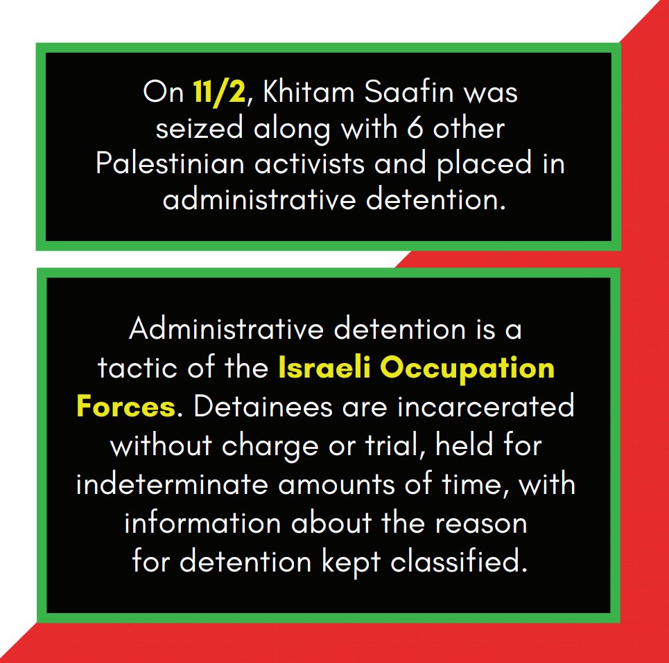 A correction to some of our earlier posts: the Israeli military doesn't defend anything so we will no longer call it the IDF. Please keep sharing information on Khitam Saafin and all Palestinian prisoners. #FreeKhitamSaafin #FreeAllPoliticalPrisoners #FreePalestine #BoycottIsraelpic.twitter.com/LDGVnZV1yk