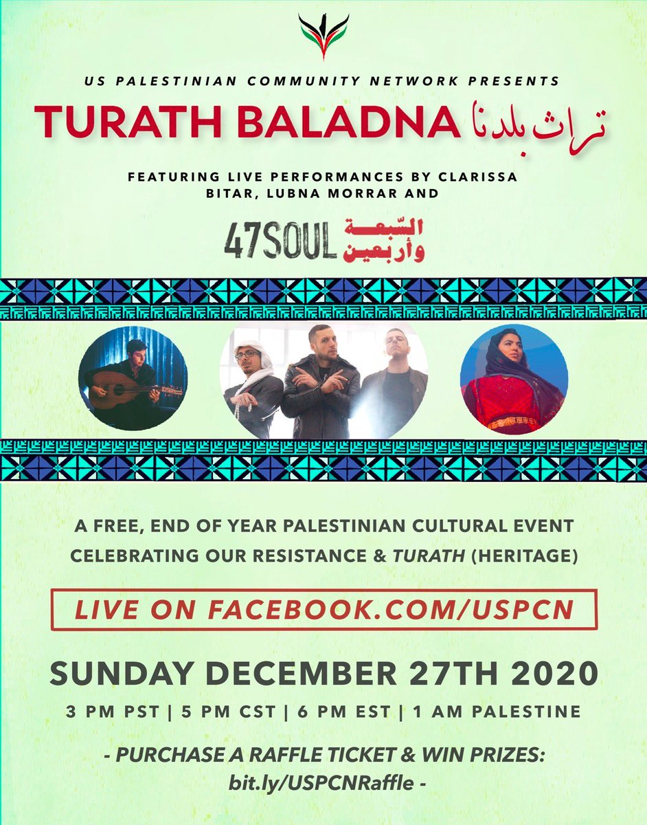 DECEMBER 27TH: Join USPCN for “TURATH BALADNA ft 47SOUL” a free, virtual end of year Palestinian cultural event celebrating our resistance & culture to be streamed live on http://Facebook.Com/uspcn ! ✨🎤🇵🇸 https://bit.ly/uspcnturath  #TurathBaladnapic.twitter.com/FBxpeg06aO