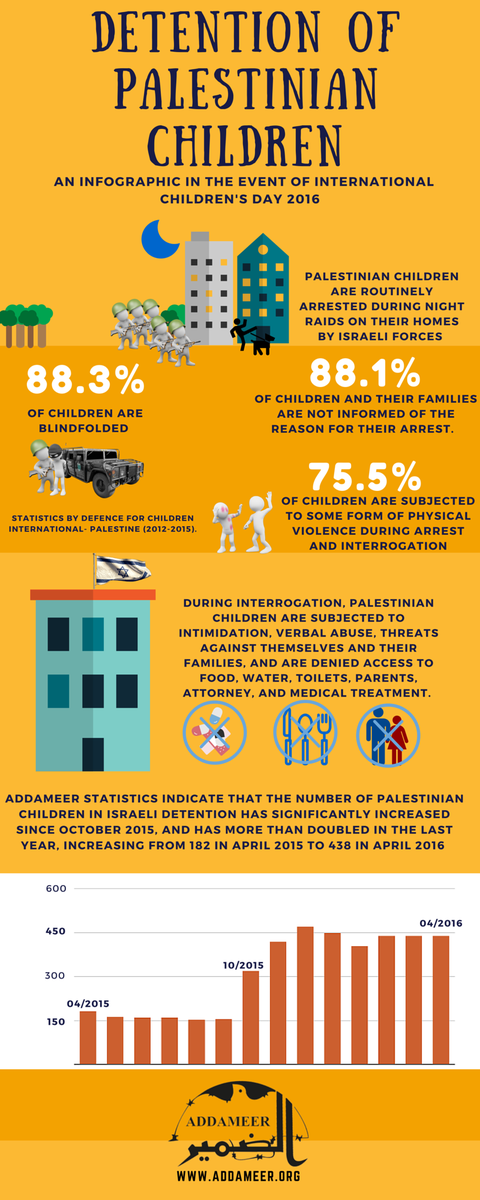Detention of Palestinian Children: infographic from @Addameer, on the occasion of International Children's Day 2016pic.twitter.com/sSAblknXM6