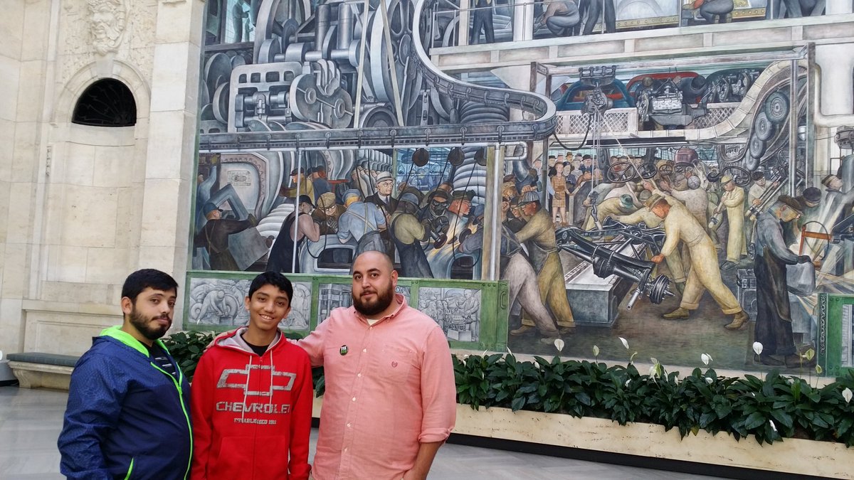 @MohammedQreaiqe (middle), brother Malek (left) & @Kawarb1988 of @Detroit_USPCN in front of #DiegoRivera mural.pic.twitter.com/LxD56sCcB2