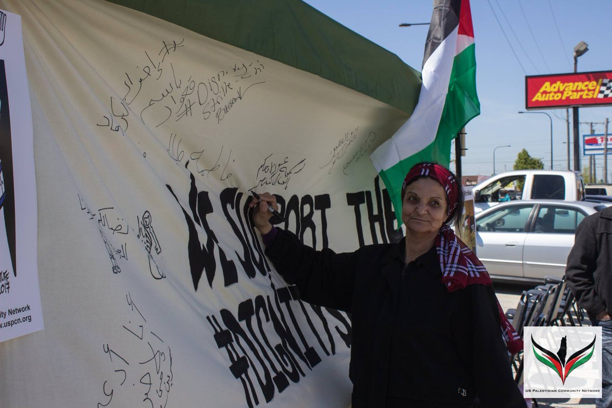 Rasmea signing a community banner in support of the Dignity Strike. Come #HonorRasmea, and thank her on Aug. 12th during the farewell event!pic.twitter.com/wQUw9UNzD1