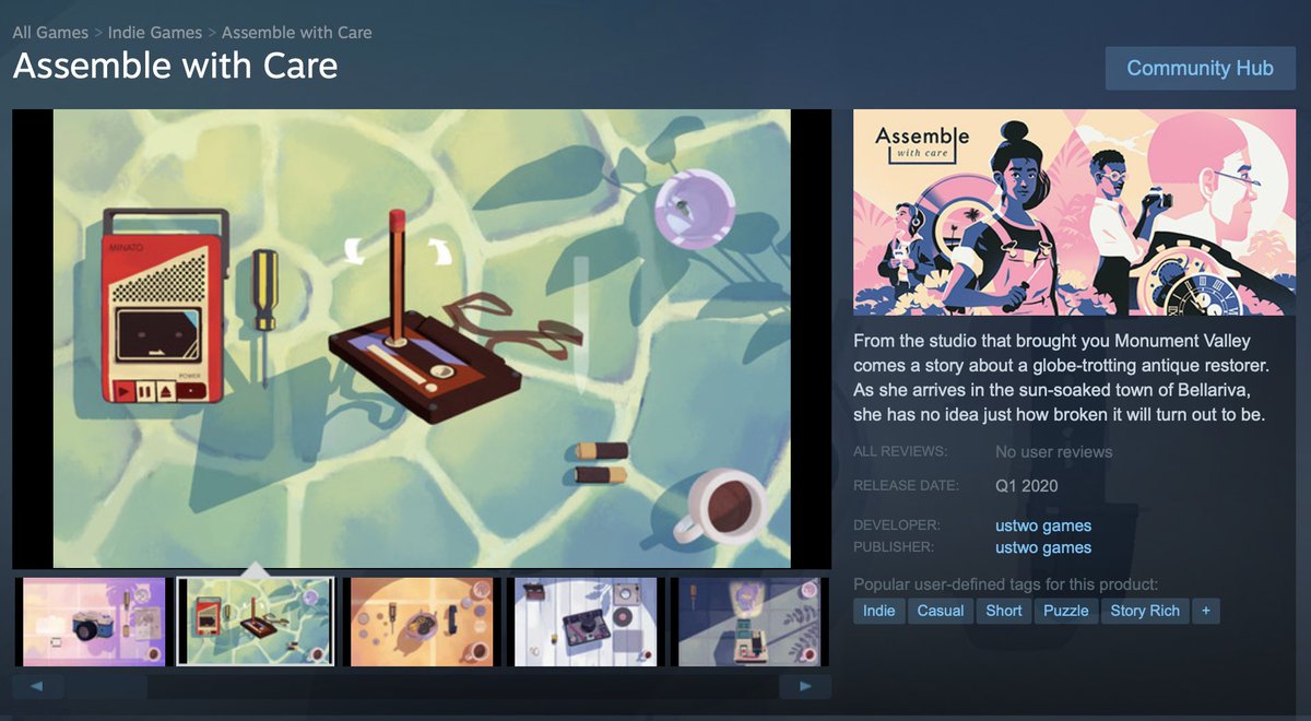 @ustwogames to bring the delightful#AssemblewithCare to Steam. Woo!https://store.steampowered.com/app/1202900/Assemble_with_Care/ …Thanks. Twitter will use this to make your timeline better. UndoUndo -