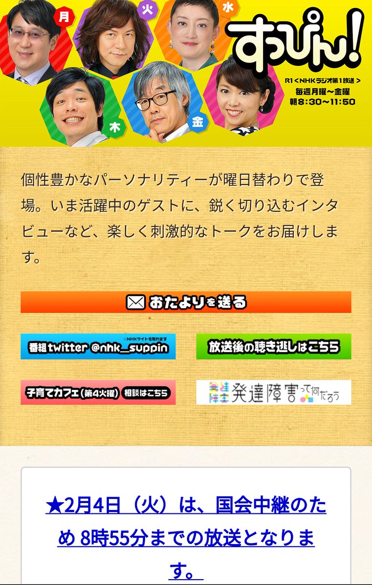 #西城秀樹 明日2月4日(火) NHKラジオ第一 『すっぴん!』 国会中継のため放送時間が 8:30~8:55に変更になりました