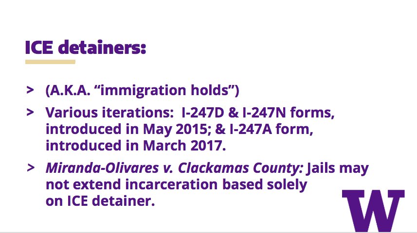 ICE detainers are controversial. In 2014, a federal judge ruled that it is unconstitutional to hold inmates beyond their release date based solely on an ICE detainer. Most local jurisdictions, including Pierce County, no longer hold inmates based solely on an ICE hold.pic.twitter.com/dsQ1RNirwf