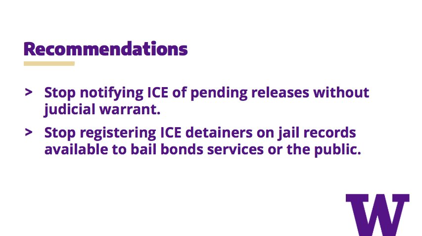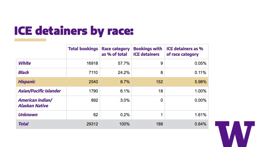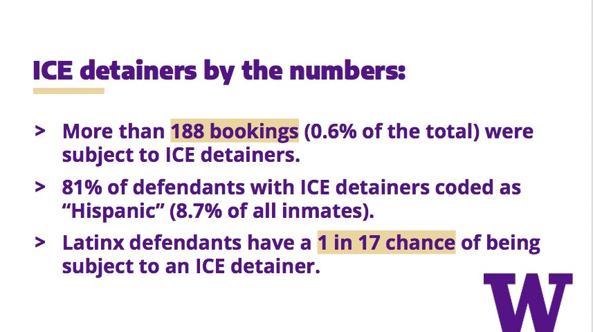 The key findings of our report: In Pierce County jail, defendants subjected to an ICE detainer spend 3.7 times longer in jail than similar defendants without detainers. Latinx people are over-represented in the population subjected to ICE detainers in Pierce County.pic.twitter.com/5pEIr2Rwk7