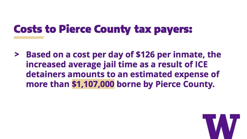 Another reason is cost to taxpayers. Based on our finding that inmates with ICE detainers spent about 47 more days in jail, on average, and at a daily cost of $126 per inmate, a rough estimate of the extra cost to Pierce Co. of honoring detainers is more than a million dollars.pic.twitter.com/bOOxVaPRnr