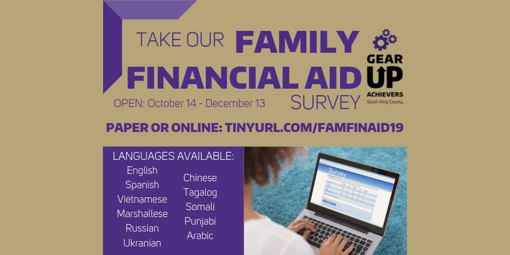 have you taken our Family Financial Aid survey yet? it will help us figure out what more information we need to share with families about financing post-secondary opportunities! Closes December 13, 2019! Available online in 11 languages: https://depts.washington.edu/gearupac/family-financial-aid-survey/ …pic.twitter.com/PDLnzoM0QE