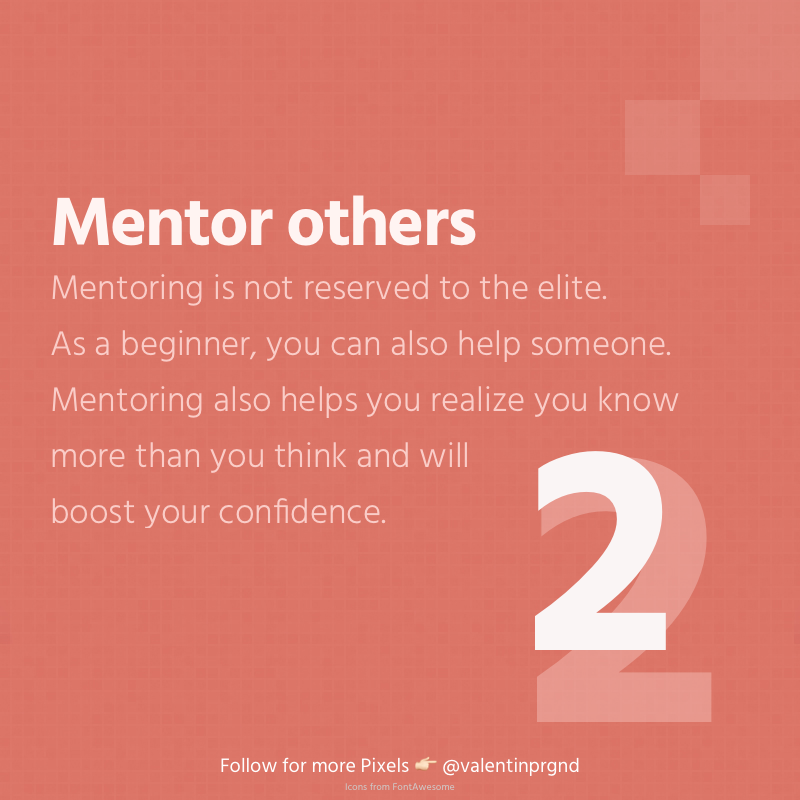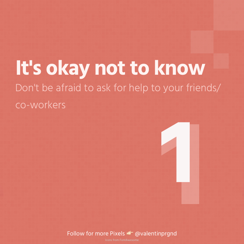 First Pixel: Tips for junior developers. When I started my career, I was a victim of Imposter Syndrome. I think it pushed me to learn, but can lower self-confidence... What are your tips to grow your career as a developer? Check my instagram for more tips: https://buff.ly/2G3kbZs pic.twitter.com/1Wb8nkM8ww