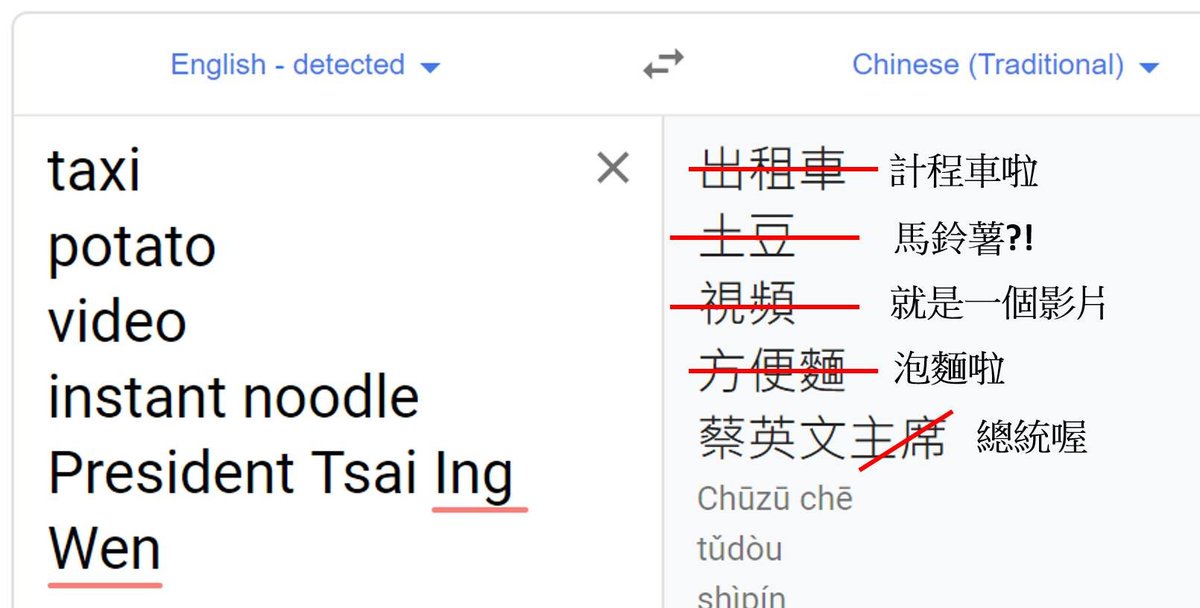 Wow I had no idea it’s this bad. This essentially makes Google Translate unusable for Taiwanese people. While zh-TW is the lang code, these phrases are translated to words used in China, which can have very different meanings in Taiwan. What’s up with this,