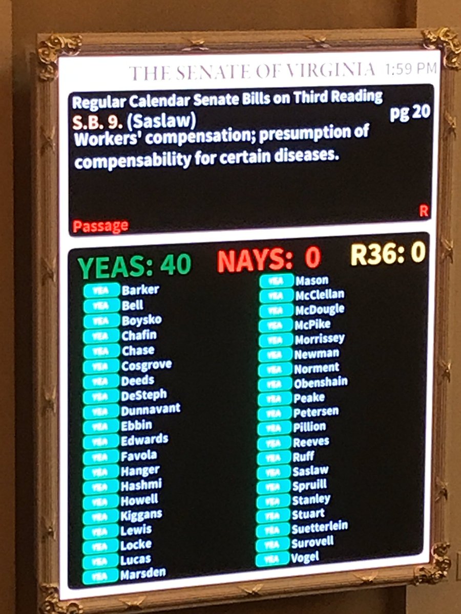 @DickSaslaw), the result of years of bipartisan work and advocacy by Sen. Cosgrove,@JillHVogel,@JeremyMcPike and others, to ensure worker’s comp assumes host of cancers are work-related for firefighters and therefore compensable, passes unanimously!@TheVaPFFpic.twitter.com/FuQZXLoFld