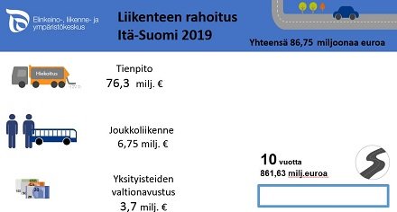 Itä-Suomessa v. 2019 rahoitusta tienpitoon, joukkoliikenteeseen ja yksityisteille osoitettiin yhteensä 86,75 milj.€.