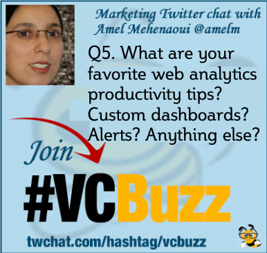 Q5 What are your favorite web analytics productivity tips? Custom dashboards? Alerts? Anything else? #vcbuzzpic.twitter.com/ZJOjLTZwAb