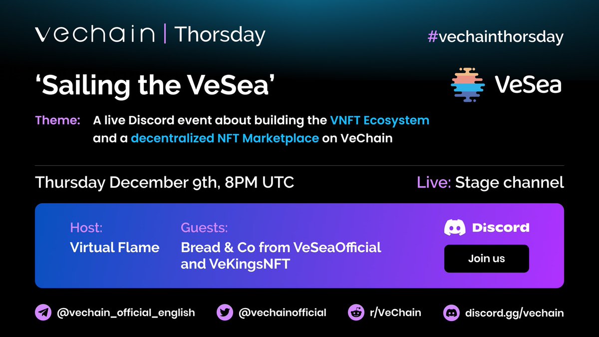 #VeChainThorsday session "Sailing the VeSea", hosted by@TheVirtualFlame with Bread & Co from@VeSeaOfficial &@VeKingsNFT! Join us at 8PM UTC in our Discord Channel http://discord.gg/VeChain for insights, developments & prizes!#VeChain#NFTpic.twitter.com/TcXlIRKo7w