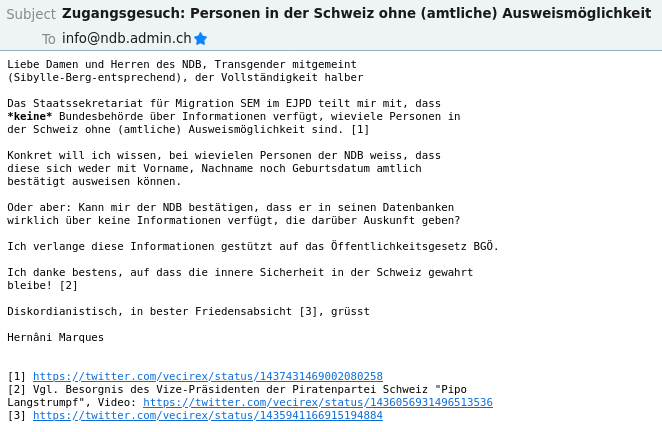Sodele, Zugangsgesuch eingereicht - ich will es vom Staatsschutz NDB noch wissen, ob die wirklich nicht wissen, wieviele Menschen ohne (amtliche) Ausweismöglichkeit in der Schweiz sind. Die