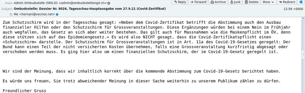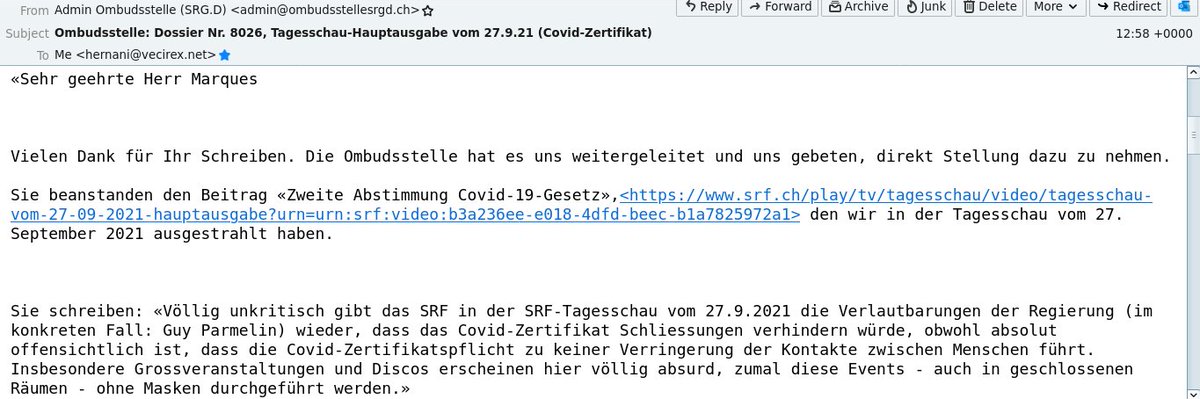Beanstandung gegen die #SRFTagesschau von gerade eben (Hauptausgabe) eingereicht - wegen Verbreitung von irgendwelchen evidenzfreien Regierungsverlautbarungen zum #CovidZertifikatFail.pic.twitter.com/YQMbsIqfph