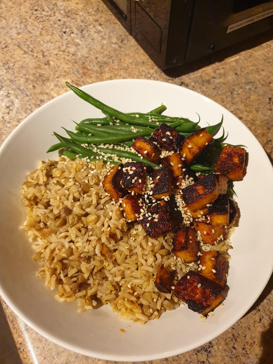 Sweet & spicy sticky tofu with blanched green beans, rice, and lentils - super easy and delicious! https://i.redd.it/fise598ya6e41.jpg …pic.twitter.com/zWCAMzQliC
