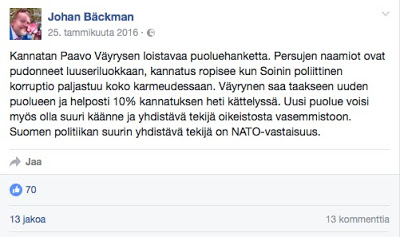 Bäckman tuntui olevan jo 25.1. kovin varma Väyrysen aikeista perustaa puolue, vaikka hän tuli asian kanssa julkisuuteen vasta 4.3. Tosin Väyrysen blogikirjoitus 25.1. antaa pohjaa arvata tai sitten Bäckmanilla oli tietoa hankkeesta, joka tuossa vaiheessa liene jo pitkällä.pic.twitter.com/ueAwVFbyAr