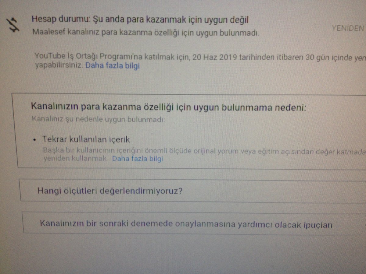 Please help I got removed from the YPP and also from my network. It says it's due to "reused content" but I only use original content and don't repost other peoples videos https://www.youtube.com/c/veliköktaş pic.twitter.com/XMH4FoFlEN