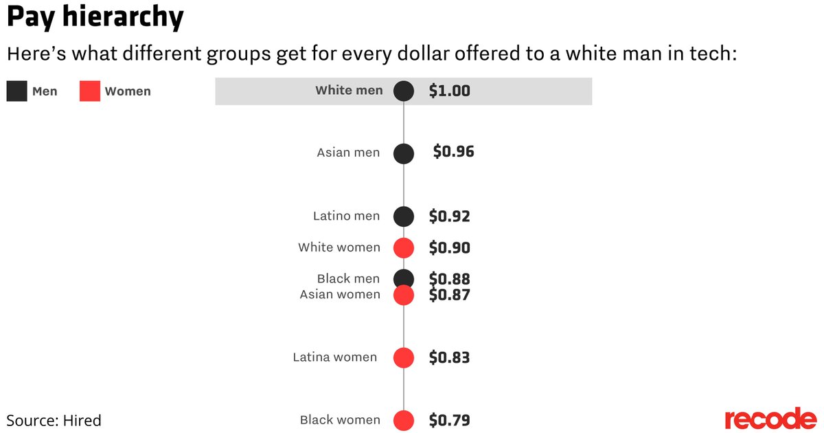 A black woman in tech makes $79,000 for every $100,000 a white man makes https://www.recode.net/2017/4/4/15160924/silicon-valley-women-race-salary-companies-average-less-data-men-tech?utm_campaign=recode.net&utm_content=chorus&utm_medium=social&utm_source=twitter …pic.twitter.com/HKNHhRPs5I