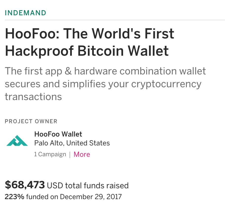How to raise almost $70k with complete bullshit claims: "HooFoo: The World's First Hackproof Bitcoin Wallet" https://www.indiegogo.com/projects/hoofoo-the-world-s-first-hackproof-bitcoin-wallet …pic.twitter.com/JRIUnf9EQl