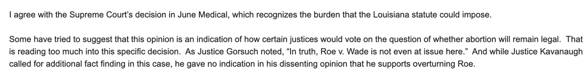New: Susan Collins says in statement she agrees with today's Supreme Court decision striking down Louisiana's abortion law. She also says Justice Kavanaugh, who dissented in the case, "gave no indication in his dissenting opinion that he supports overturning Roe"pic.twitter.com/QTLkLf0euv
