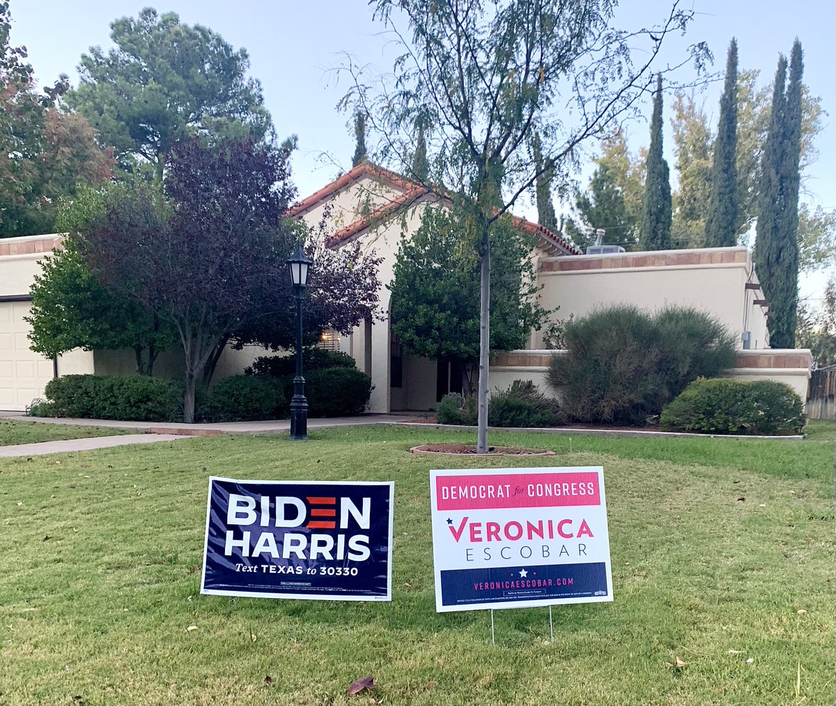 My El Paso Upper Valley neighborhood is chock full of Trump lawn signs. Then there’s Casa Rosendorf, with our @JoeBiden and @vgescobar campaign signage. I’m certain there are more Democrats lying low along our streets—hopefully, our plucky effort will hearten our hidden comrades.pic.twitter.com/M5mE8ozbGE