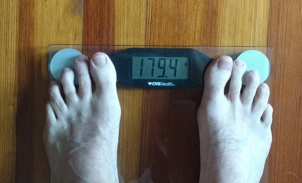 3/ Right now, Friday night, I am well fed and well hydrated, weighing in at a robust 184 pounds, which is on the high side of my typical daily weight fluctuation. I'll weigh myself again on Monday morning after some strategic dehydration and well compare the difference.