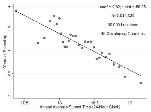 Amazing fact: people living in locations with late sunsets tend to have lower school achievement.