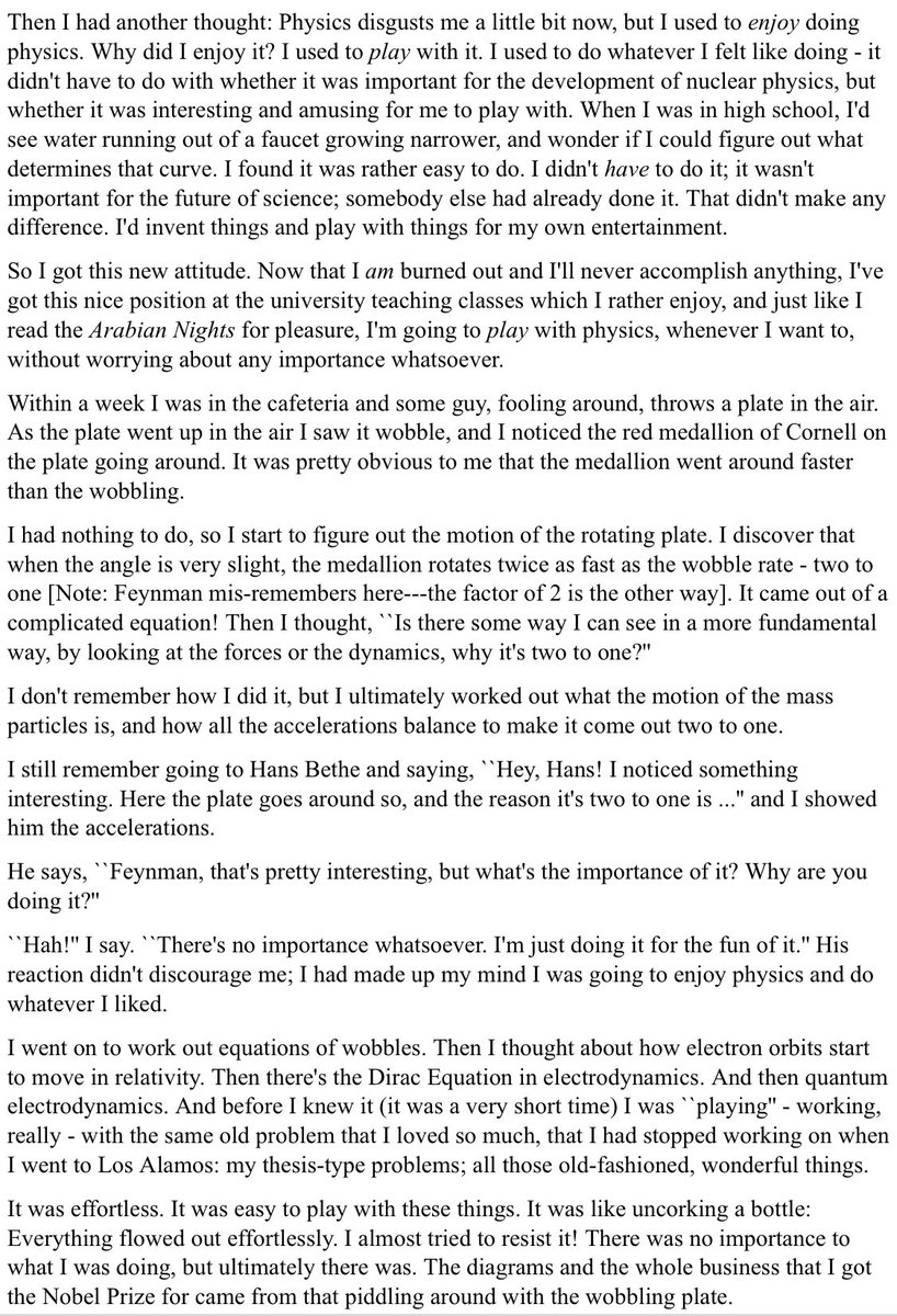 I think a lot about how Feynman got his Nobel Prize from “piddling around with wobbly plates”. I’m always looking for wobbly plates to piddle with.