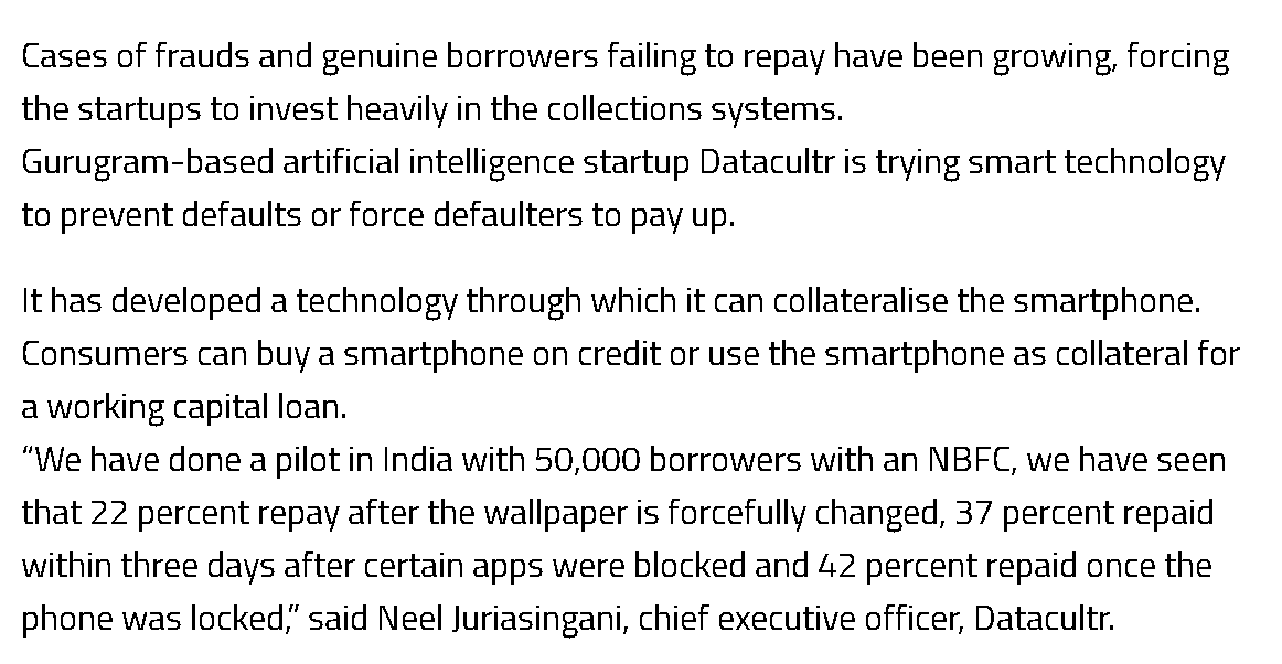"Collateralize the smartphone" - apparently means remotely changing wallpapers, blocking apps, and locking the phone. For recovering money lent. India fintech lending/recovery space is lit! (lest we forget, thank you Android!)
