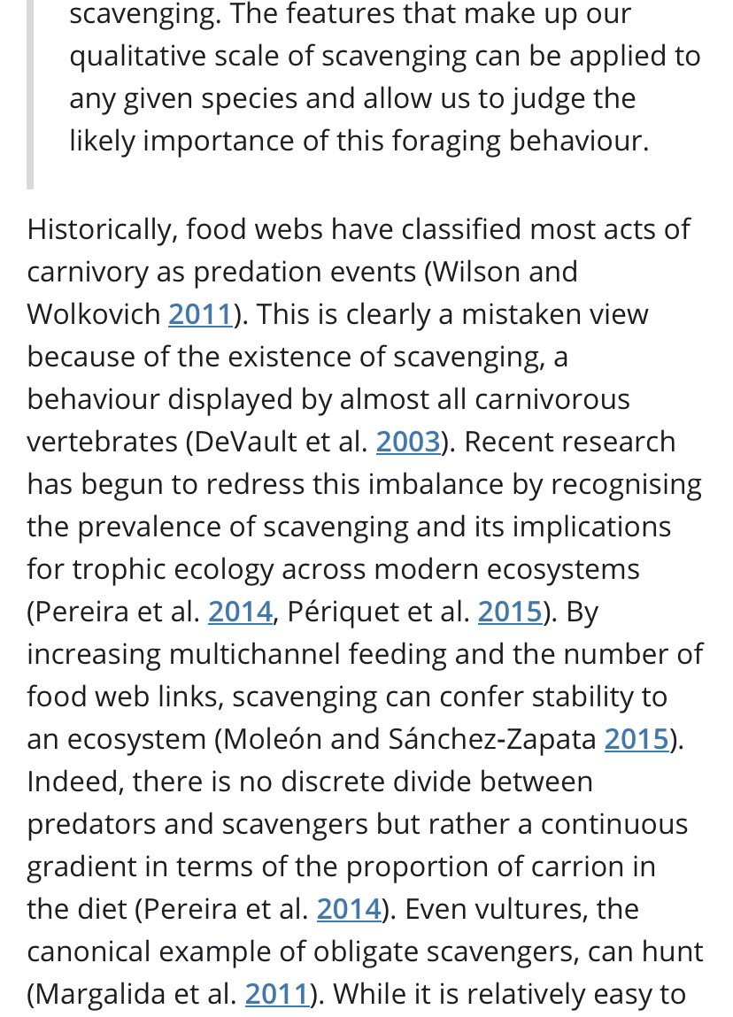 There’s a case for replacing the focus of carnivore studies on predation with a scale of scavenging instead: “there is no discrete divide between predators and scavengers but rather a continuous gradient in terms of the proportion of carrion in the diet” onlinelibrary.wiley.com/doi/full/10.11