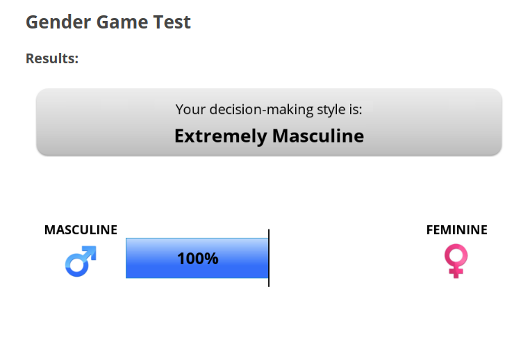 The answers really were my honest ones. Didn’t even try to game it. If you want to game it to be 100% masculine, just maximize your own payout, and if there’s a tie, just maximize whole group payout.
